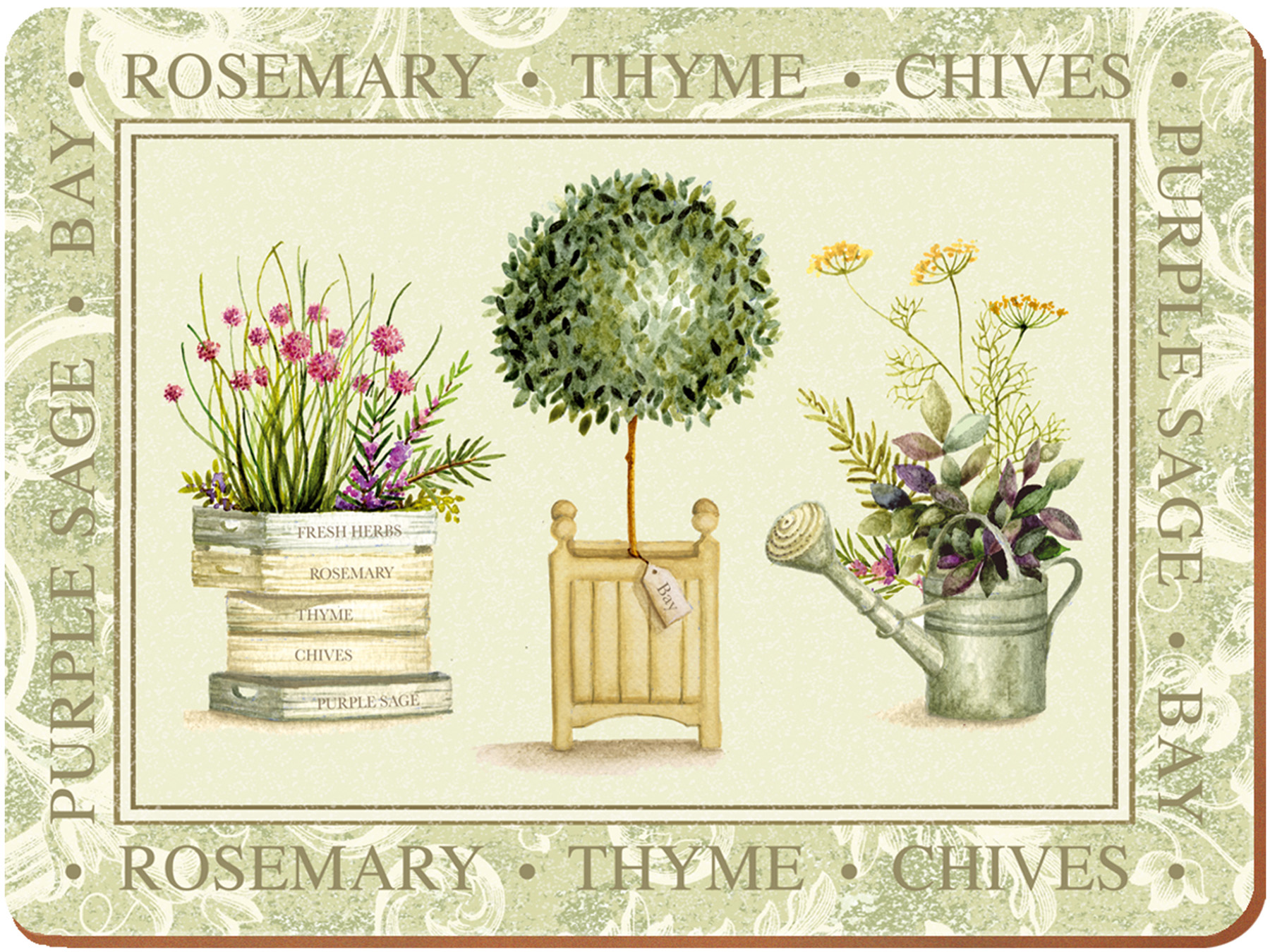Protect your table with this fantastic set of four cork-backed placemats, decorated with illustrations of growing herbs and framed with calligraphy-style writing. Natural shades of green and cream flow throughout.