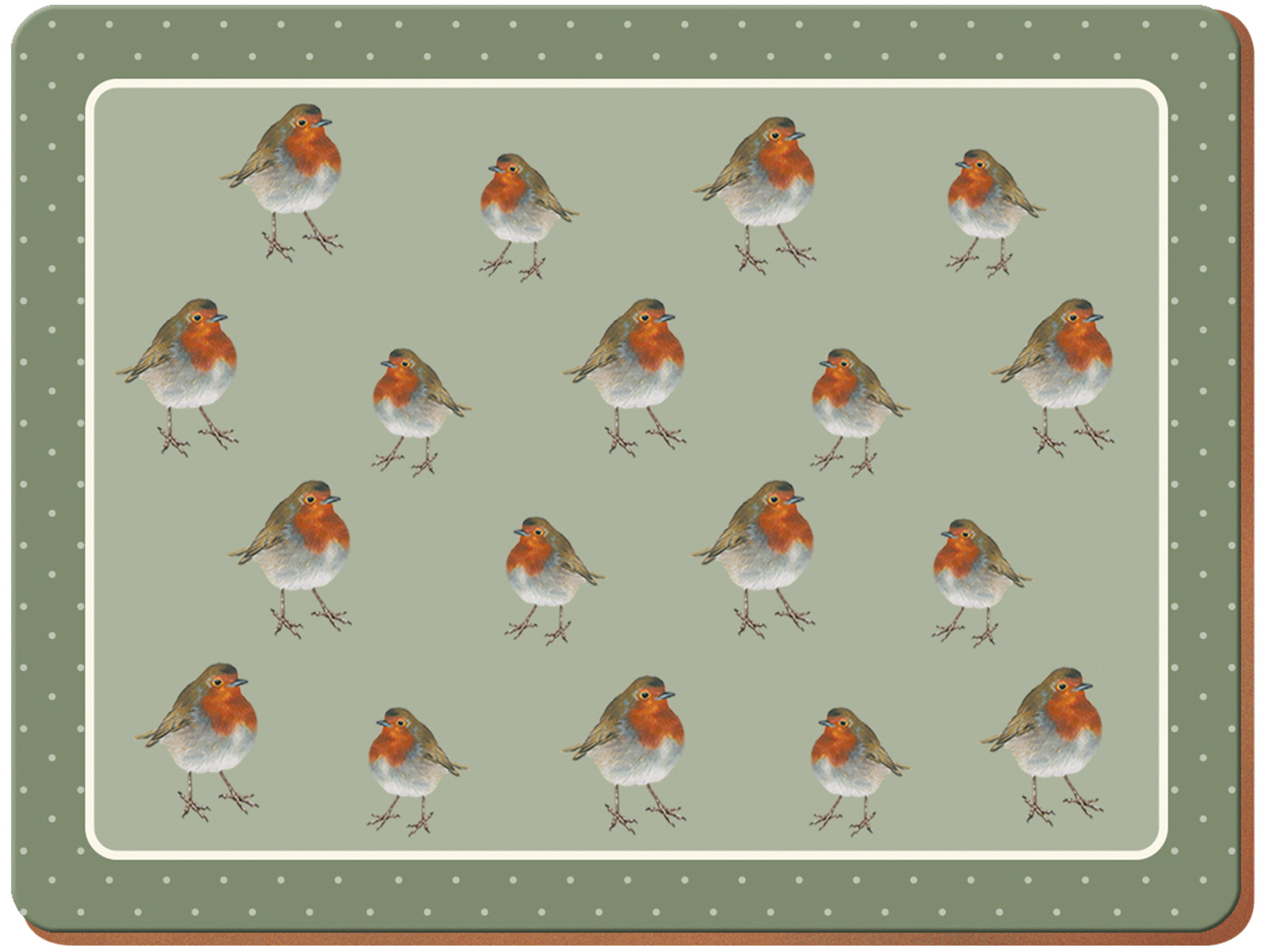 Protect your table with this fantastic set of four colourful cork-backed placemats, featuring hand-drawn illustrations of colourful robins, set on a sage green background with polka dots around the border.