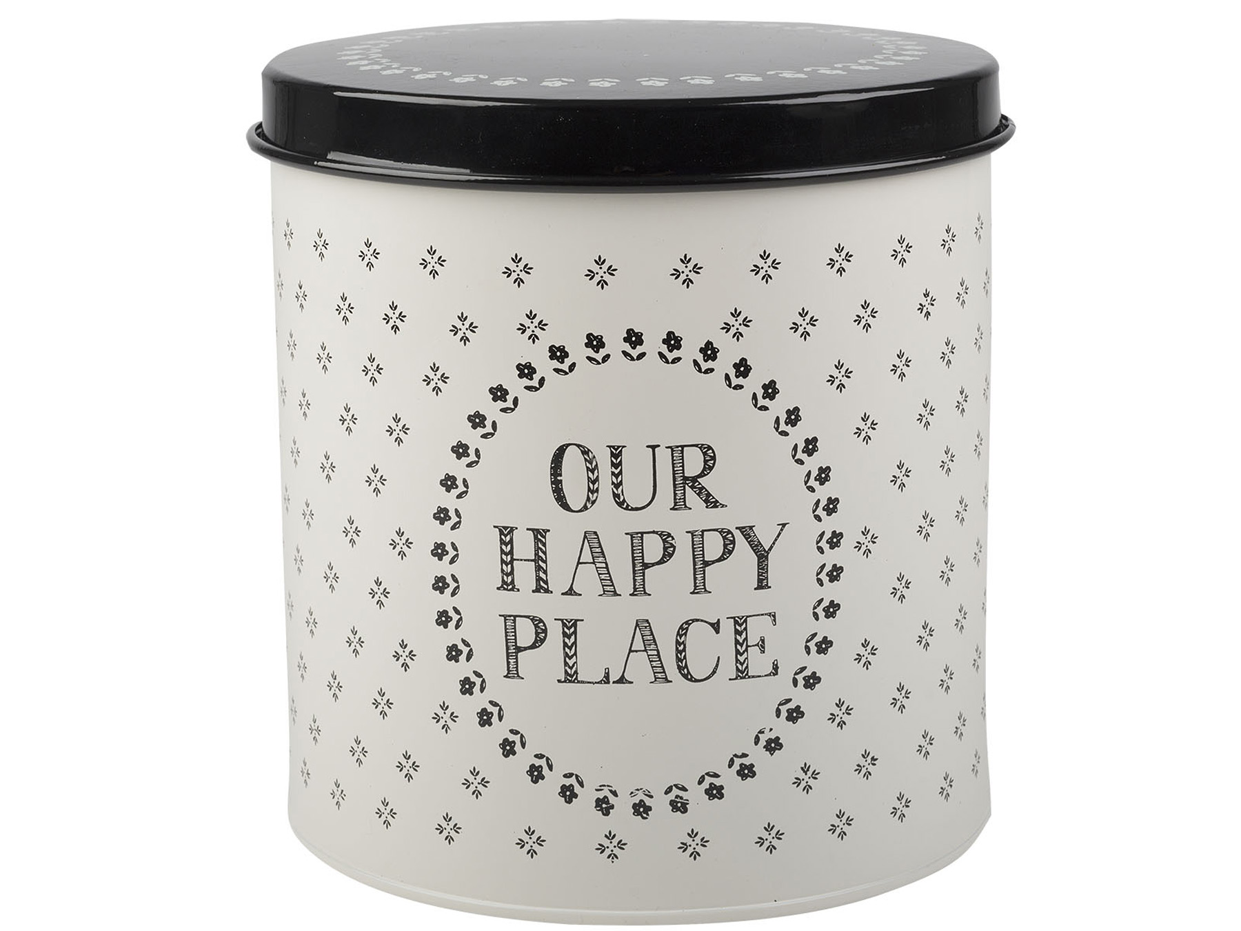 Keep your kitchen neat and tidy, while adding a fun, rustic look to your décor with this quirky metal storage canister. This handy tin features classic tones of ivory and black, printed with ‘our happy place’ in a fun, hand-drawn font.