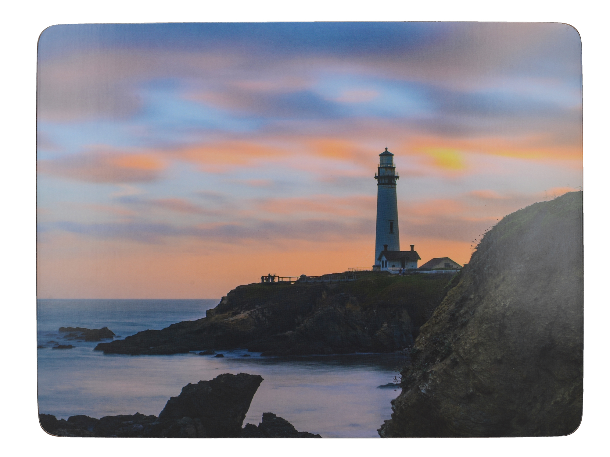 Protect your table with this fantastic set of six cork-backed placemats, featuring a delightful photographic image of a coastal landscape at sunset.