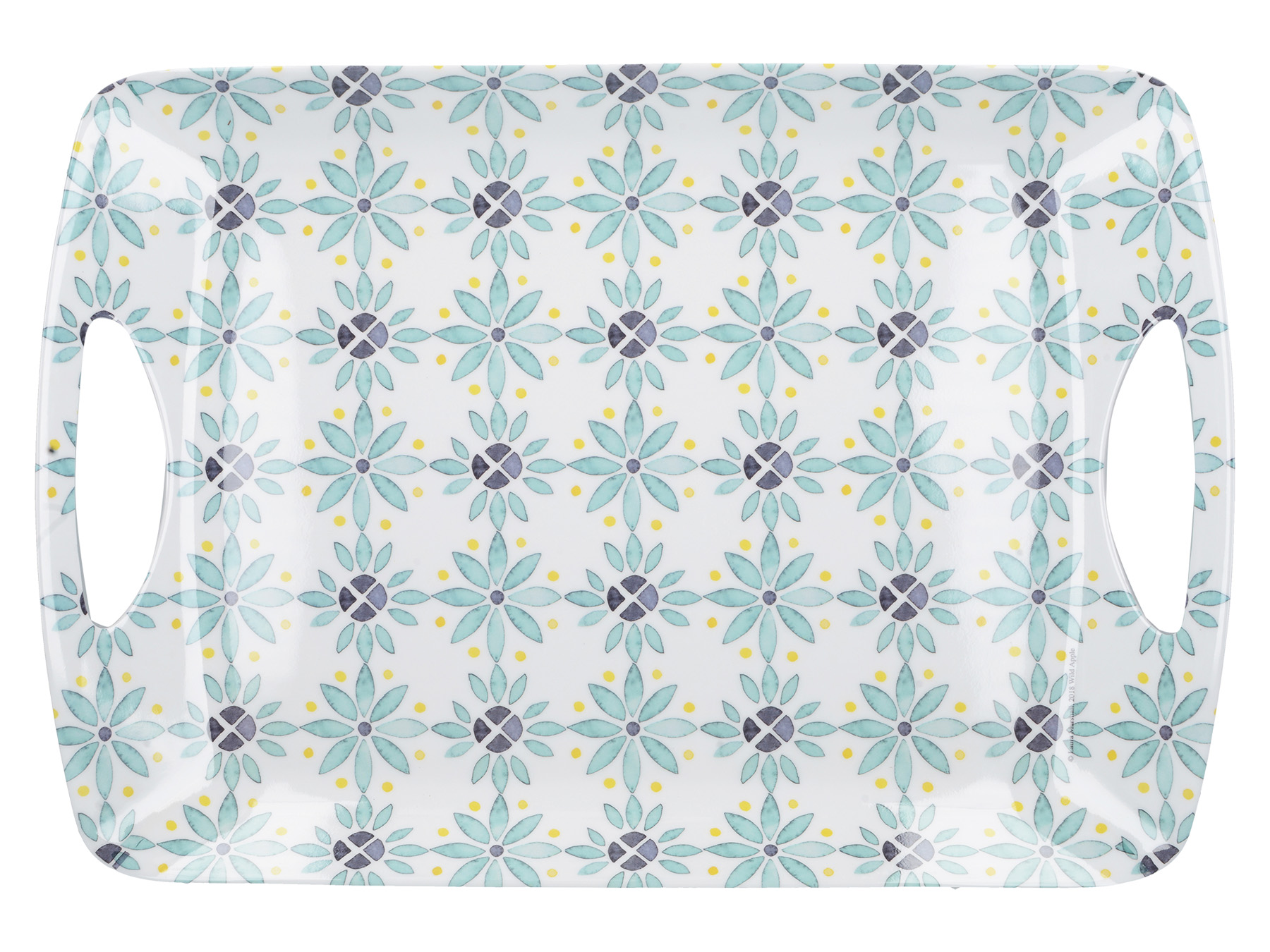 The 'Green Tile` Large Melamine Tray features an abstract flowery pattern, where geometric teal shapes form petals in a tile-like formation. It contrasts harmoniously with a clean white canvas, bringing an opulent, almost ornamental look to your home.