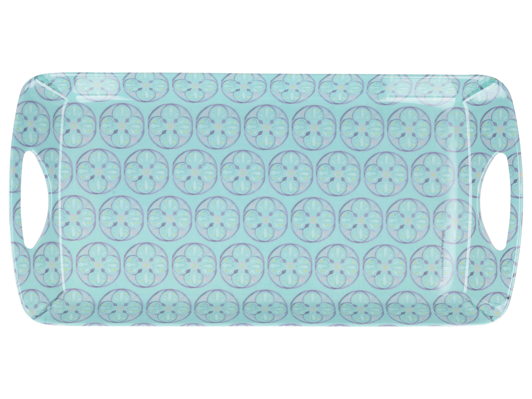The Creative Tops 'Green Tile` Small Melamine Tray features an abstract flowery pattern. Mosaic-like circles feature little petals to create a flowery display against a turquoise-coloured background.