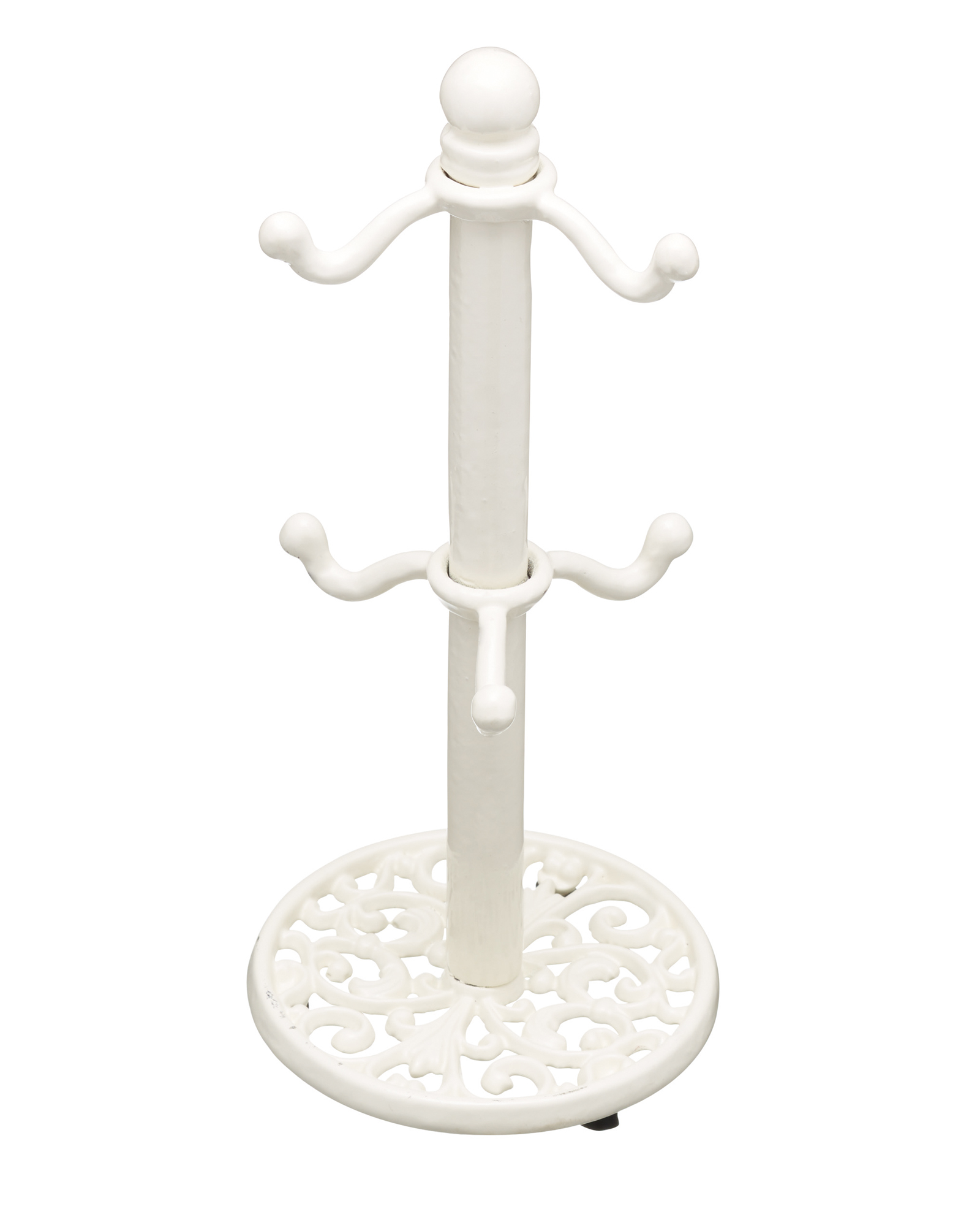This pretty mug holder has a reassuring weightiness, keeping it firmly in place on kitchen worktops. This is balanced with a round filigree-patterned base and a crisp coat of white enamel paint, which will look beautiful in any setting.
